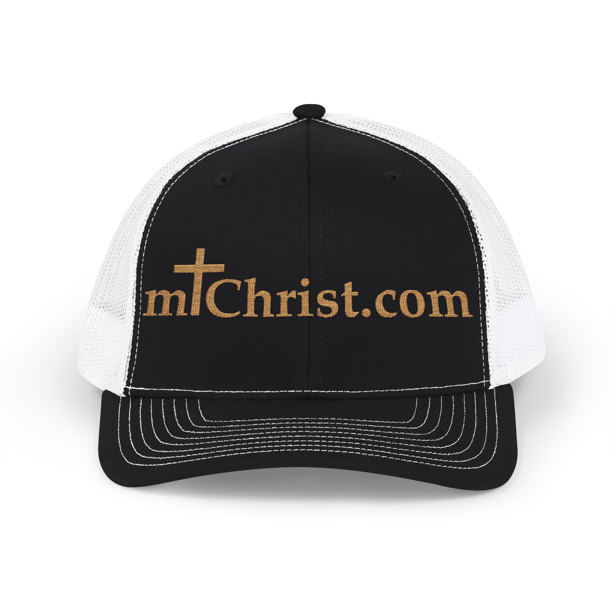 This structured trucker cap brings quiet faith to everyday wear. The embroidered gold-tone scripture-inspired logo sits proudly on a black front panel, while breathable white mesh keeps long days comfortable. A precurved visor and cotton sweatband make it feel familiar from the first wear; an adjustable snapback lets you dial in the fit. Wear it on morning runs, volunteer days, or when you want a subtle reminder of what grounds you — it layers easily with hoodies, denim jackets, and Sunday best alike.